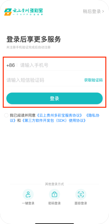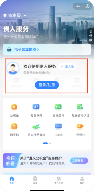 2.进入“贵人服务”小程序点击注册登录,选择一键登录,未注册用户完成登录后自动完成注册,进行人脸识别,完成实名认证。