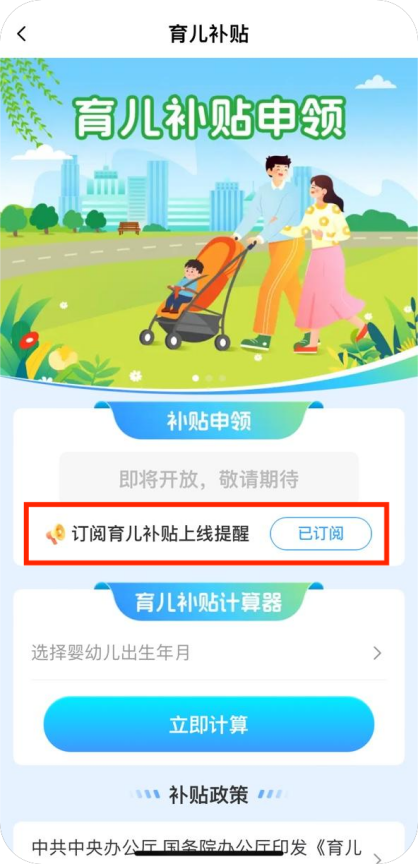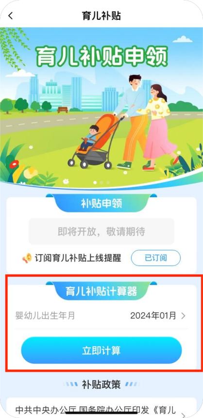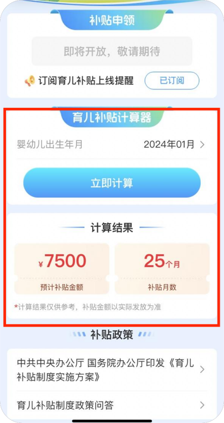 从2025年1月1日起,对符合法律法规规定生育的3周岁以下婴幼儿发放补贴,至其年满3周岁,补贴金额将按月数折算后发放,用户现可通过“育儿补贴计算器”功能进行查询,根据出生年月选择,计算出可领取的补贴金额。