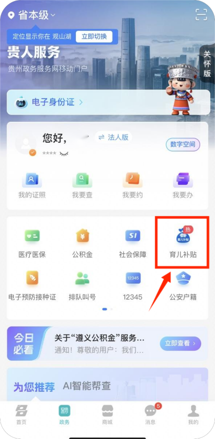 贵州省政务服务平台的育儿补贴申领入口预计于8月底正式上线并开放使用。用户可进入“贵人服务”支付宝小程序、“贵人服务”微信小程序和多彩宝APP政务专版【育儿补贴】服务入口,一键订阅,入口开放后将第一时间收到申领通知。