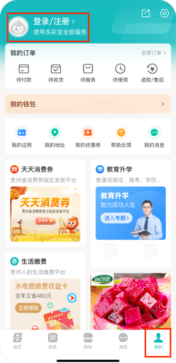 2.进入“多彩宝”APP首页点击“我的”—登录/注册,首次注册用户输入手机号获取验证码即可完成注册,完成注册后,点击头像进入账号管理,完成实名认证。