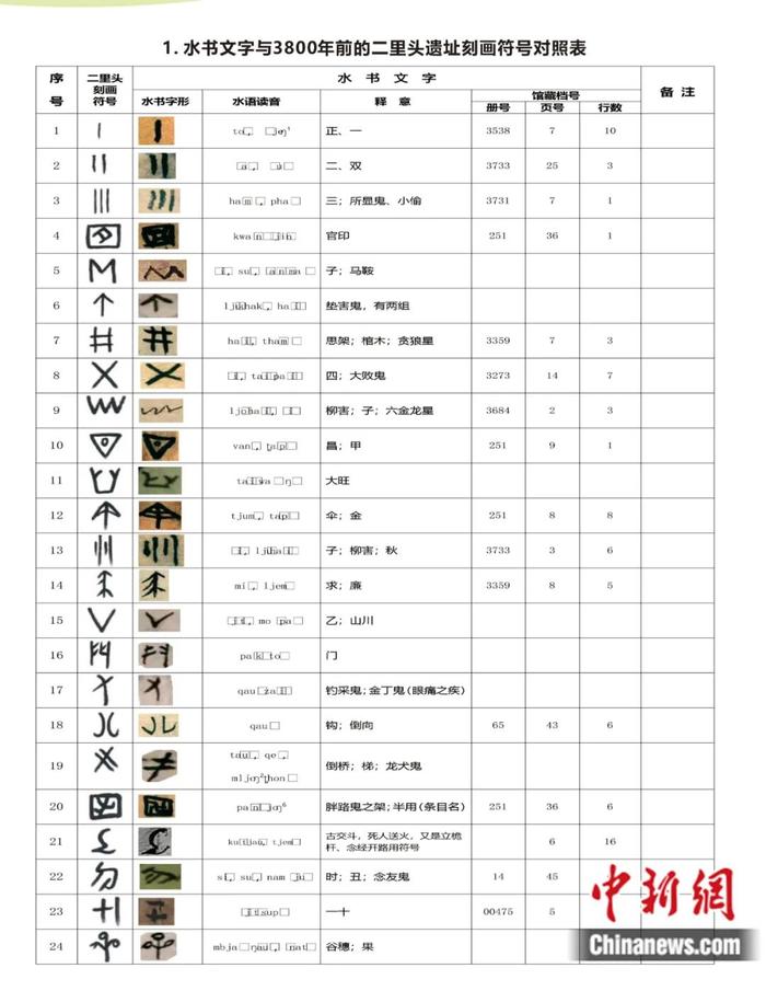 中国水书文字与3800年前的二里头遗址刻画符号对照表。黔南州档案馆供图