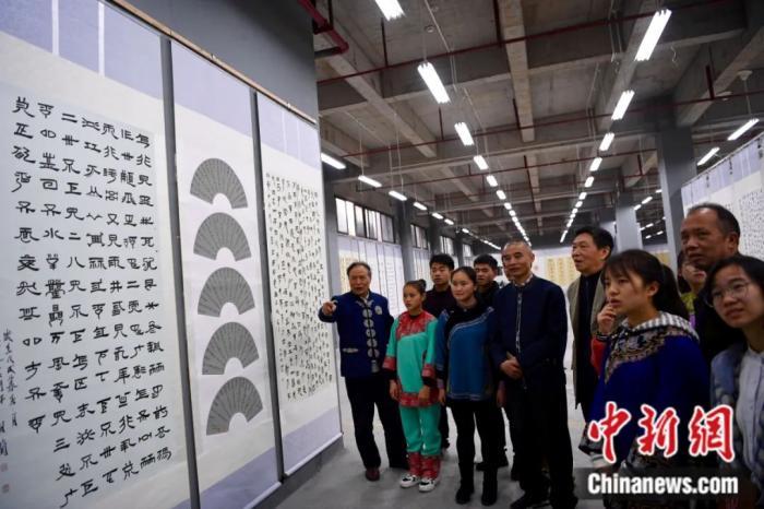 贵州省黔南布依族苗族自治州三都水族自治县,参观者在“水族文化博物馆”听讲解员介绍“水书”。 中新社记者 瞿宏伦 摄