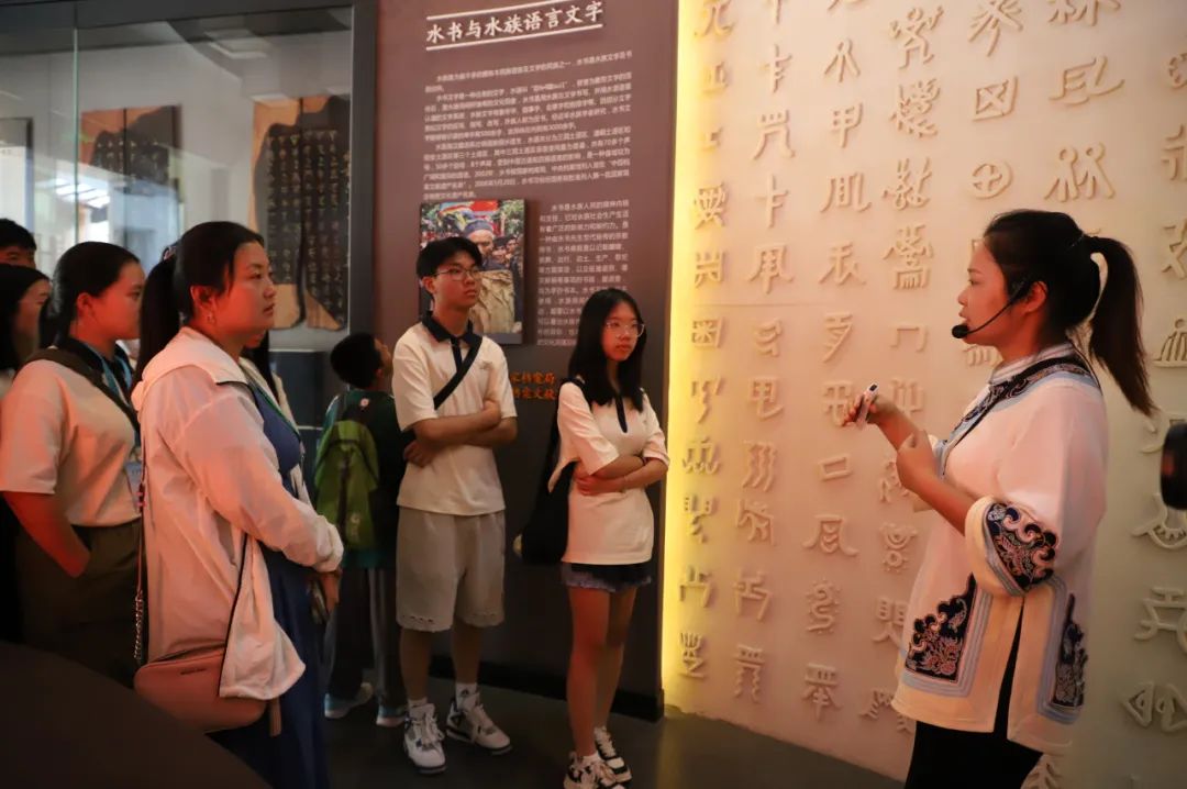 走进贵州水族博物馆,听了被誉为“活着的象形文字”古老的“水书”介绍时,青少年们纷纷好奇地凑近展示墙,手指轻轻点着水书符号,跟着讲解员学习水族发音,更是饶有兴致地试图从字形中找寻与自然相关的线索。展柜中一件件古老而精美的水族绣品,牢牢吸引了众人的目光,不少孩子拿出手机,细细拍摄马尾绣那精致巧妙的纹理。
