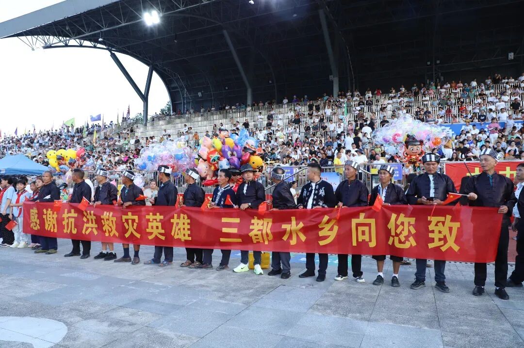 1350名群众组成的迎接队伍在道路两侧热烈欢迎,向他们致以最崇高的敬意。献礼环节中,红鸡蛋、马尾绣香包等充满寓意的礼物,传递着三都人民的感恩之情。