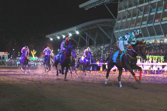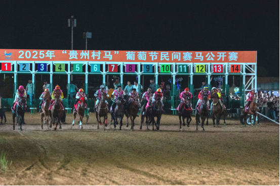 夜幕降临,此次活动的一大亮点——贵州村马首次夜跑赛事与民族赛邀请赛接连上演。夜跑赛道上,参赛选手们迎着晚风奔跑,赛道两侧的灯光与欢呼声交织,展现出运动的活力与夜晚的独特魅力。随后,“贵州村马”民族赛邀请赛精彩接续,万马奔腾的壮观景象让人热血沸腾,激烈的赛马比赛、精彩的马术表演赢得了观众的阵阵掌声。