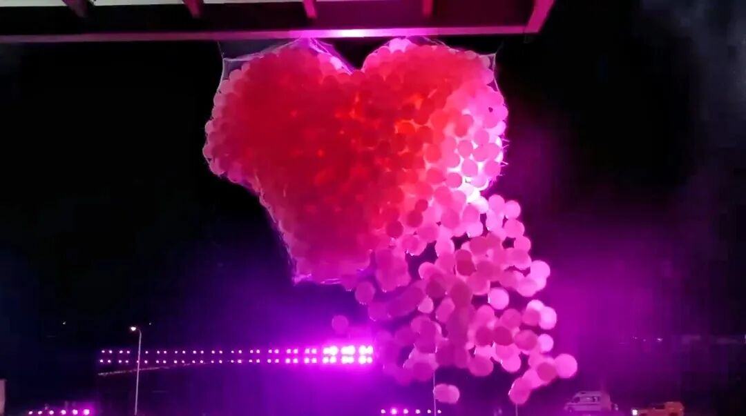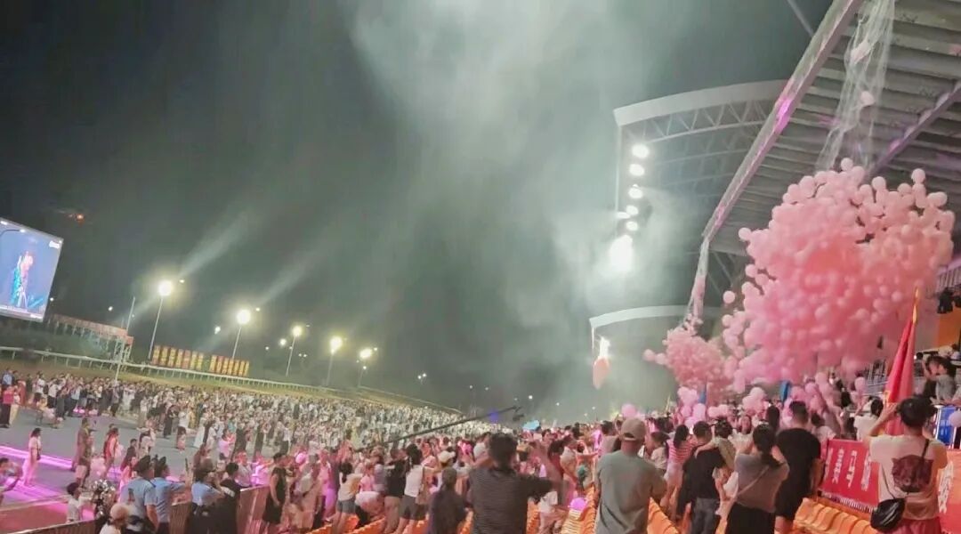 活动高潮在粉红色球雨中骤然降临!漫天粉球飘落的瞬间,全场齐唱经典老歌《当》,数万名观众举起手机打开闪光灯,汇成一片“星海”,灯光与粉球交织,宛如梦幻仙境。最后的篝火晚会更是将氛围推向顶点,免费领取的荧光仙女棒、荧光面具点亮黑夜,大家围着熊熊篝火载歌载舞,在动感音乐中邂逅浪漫,让三都的七夕之夜,成为一场属于所有人的“星光狂欢派对”!